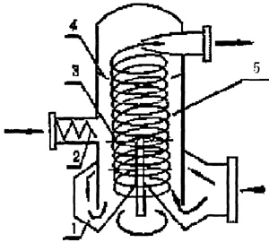 1、熱風分配器 2、螺旋加料器 3、攪拌器 4、分級器 5、旋轉(zhuǎn)干燥室