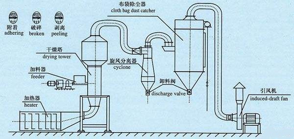 待干燥的料液,經(jīng)料液輸送泵送入噴霧塔,被加熱后的壓縮空氣霧化覆蓋在呈沸騰狀態(tài)的惰性粒子(媒體)表面,形成料膜包覆層,同時受到熱風(fēng)和媒體的雙重傳熱,其水份迅速蒸發(fā)而被干燥。由于媒體激烈運(yùn)動,干燥后的物料包覆層因碰撞破碎而成粉狀產(chǎn)品,隨熱風(fēng)排出,進(jìn)入旋風(fēng)分離器而被捕集下來,尾氣則進(jìn)入袋濾器,再次過濾后排出。